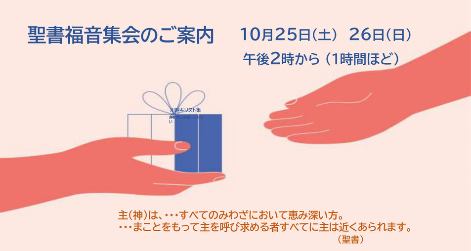 川越キリスト集会では、聖書に興味がある方に、聖書が何を語りかけているのか、私たちにどのような幸いをもたらすのかをお伝えするために、聖書福音集会を下記の日に開催します。お気軽にお越しください。